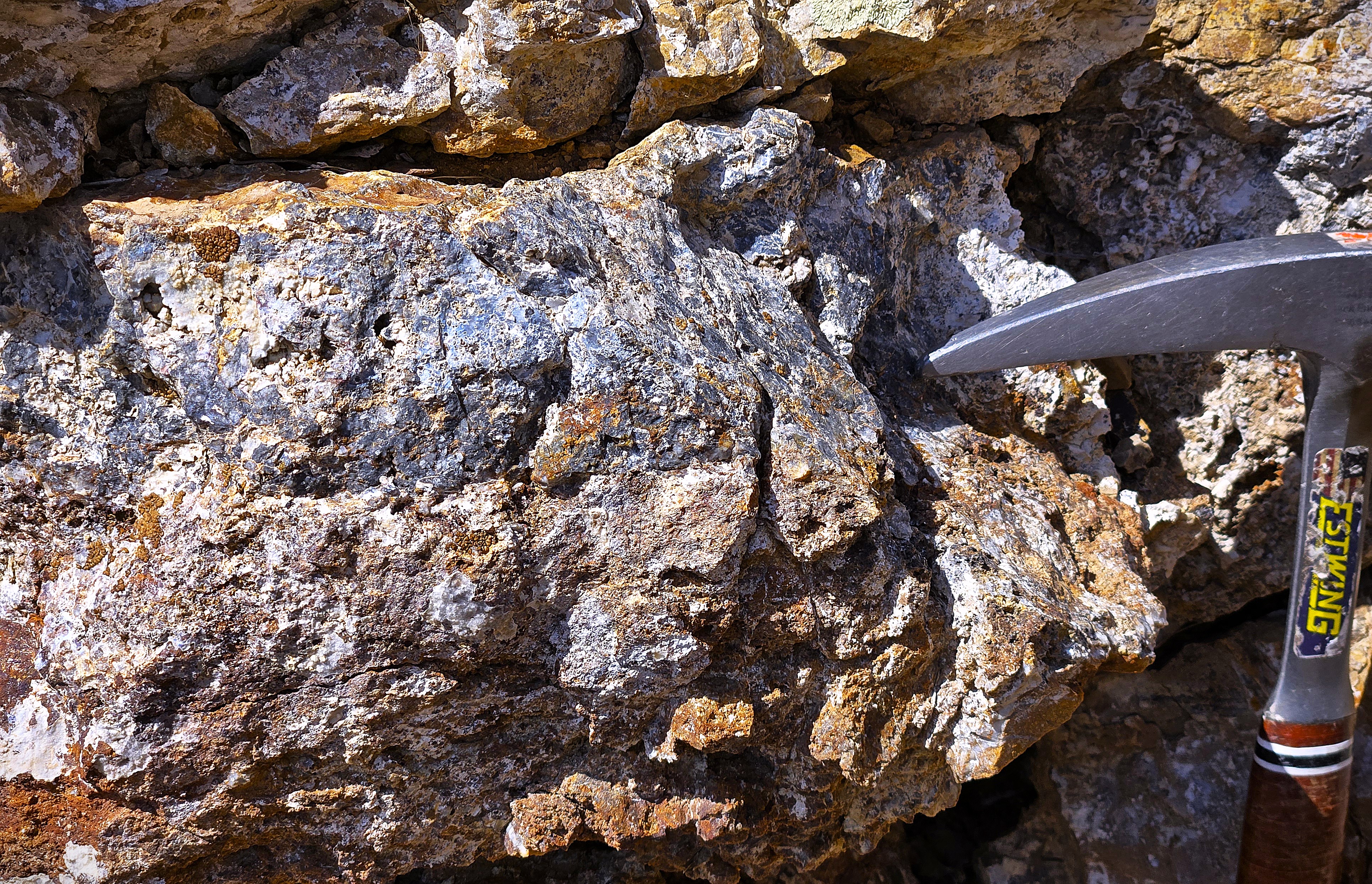 Observed mineralization includes silica-carbonate replacement textures, structurally localized sulfide mineralization, and oxidation products consistent with historic silver-lead-zinc systems.